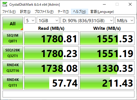 1年ほど使用しているものなので、SSDは他のレビューと比較すると速度低下が大きいですね💦